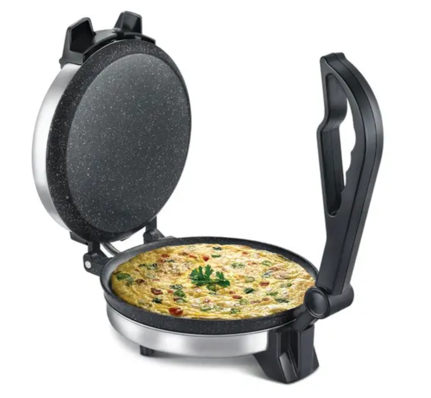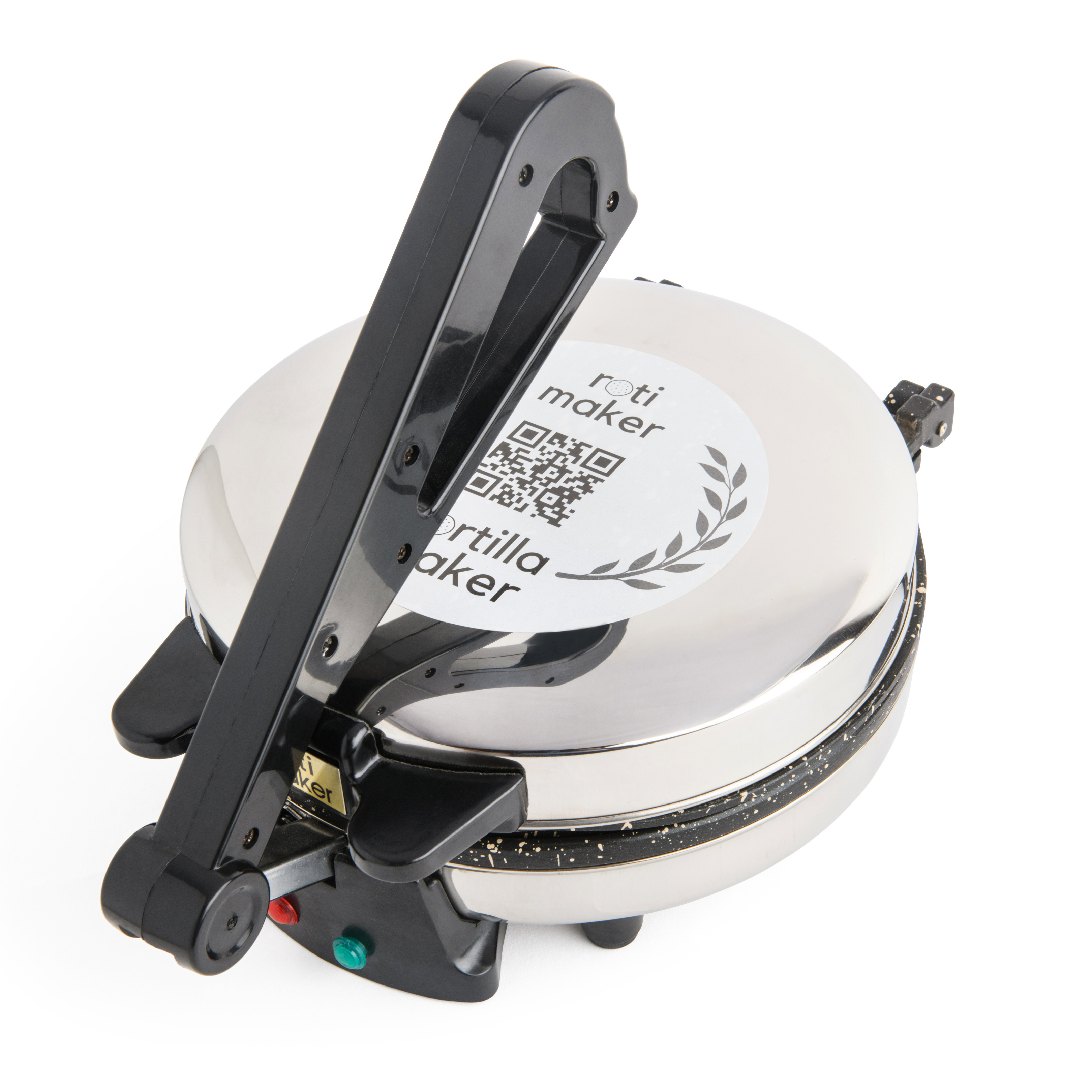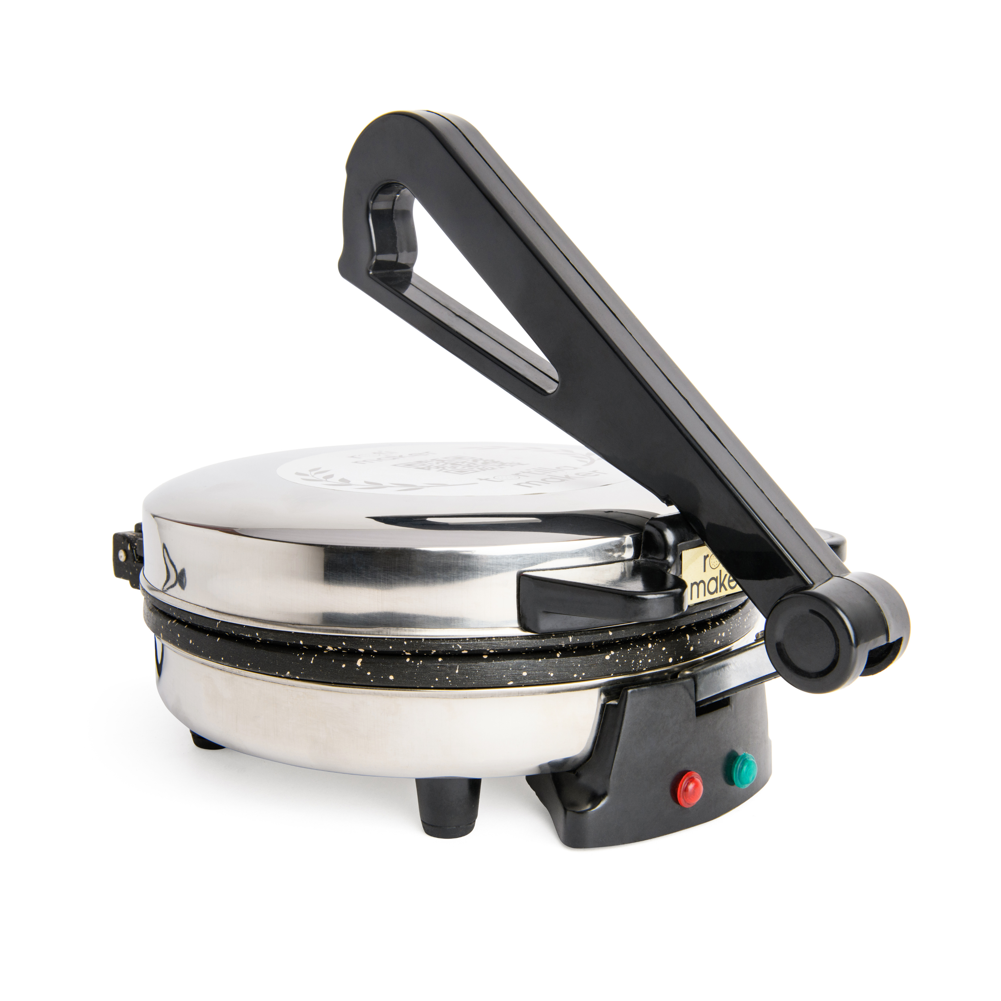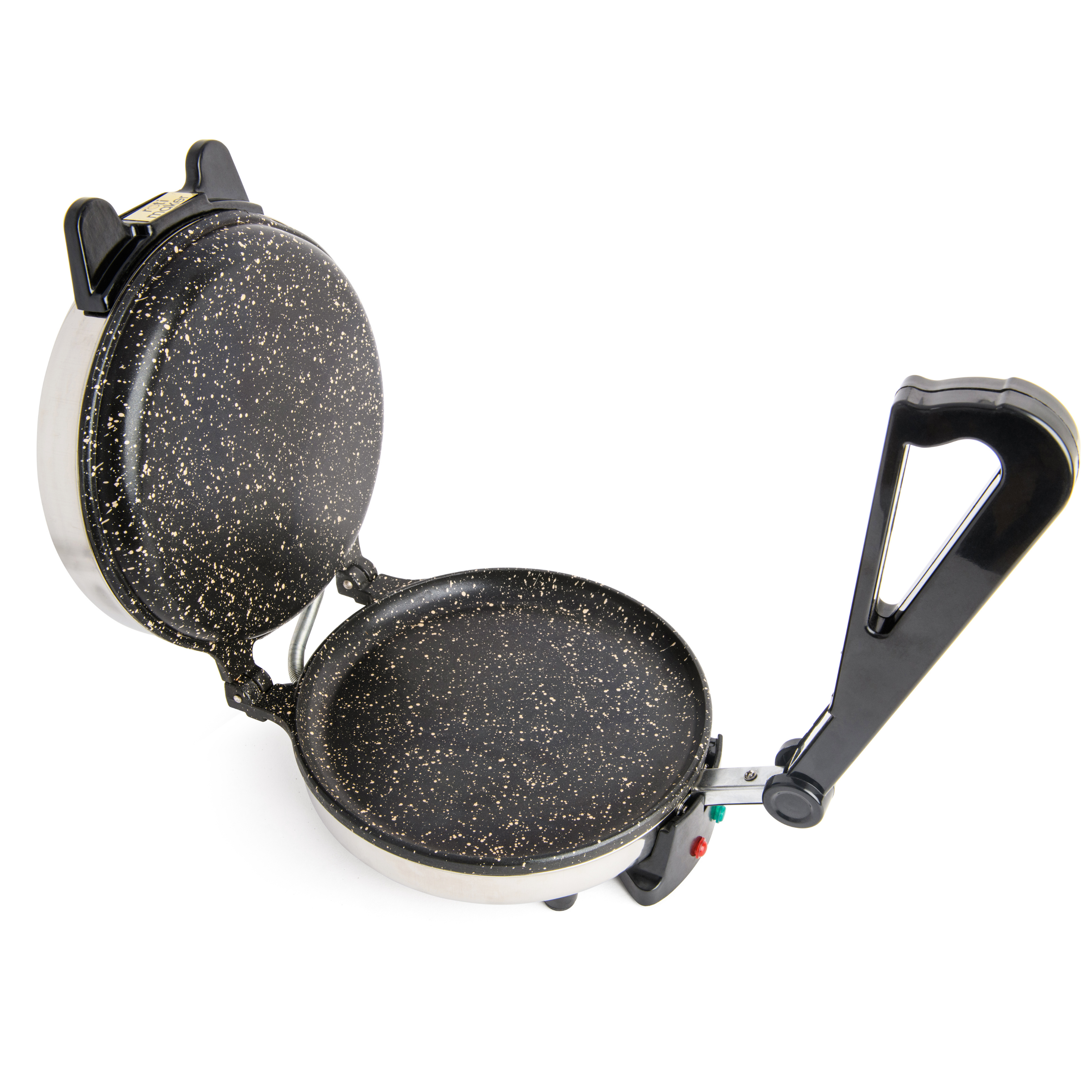 - Improved heated top and bottom plates apply even heat distribution that presses your dough flat.